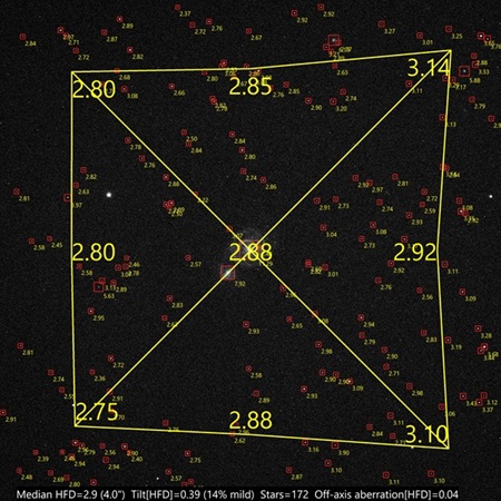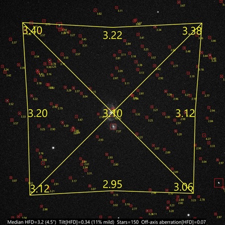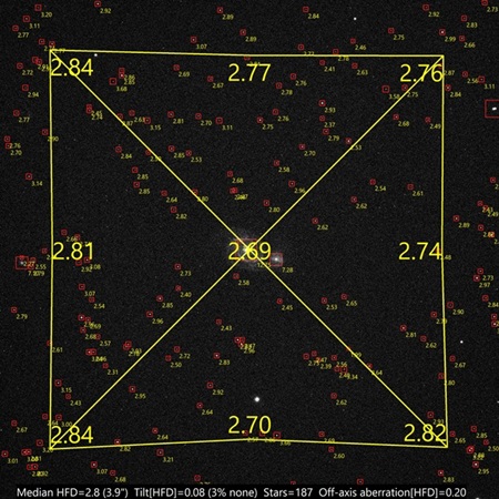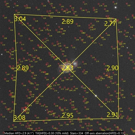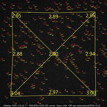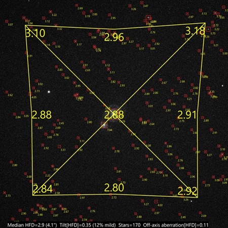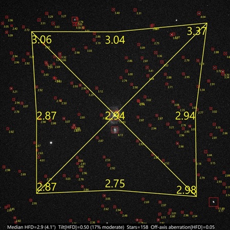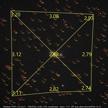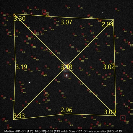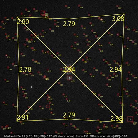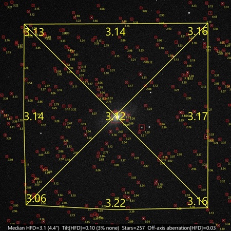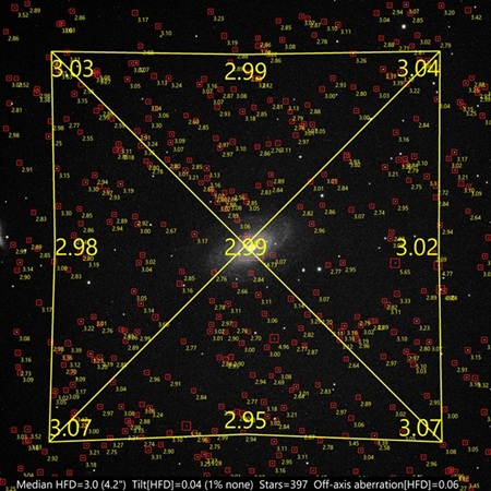 In this orientation I was pleased to see that there was very little tilt at all! With the meridian almost reached I slewed the scope to a location about 2.5 hours before the meridian to check that the results were the same. Fortunately there was very little change. Since it's possible that the sensor tilt could be caused by flexure, I carried out a meridian flip and positioned the scope towards a location approximately 3.5 hours post meridian with the scope on the eastern side of the mount. The sensor tilt analysis changed very little which was good news as it means it's unlikely to be caused by flexure and the tilt should remain corrected regardless of where the scope is pointed.